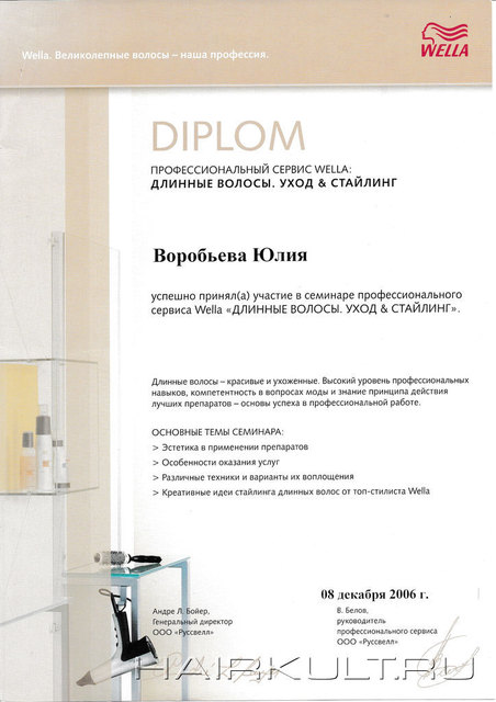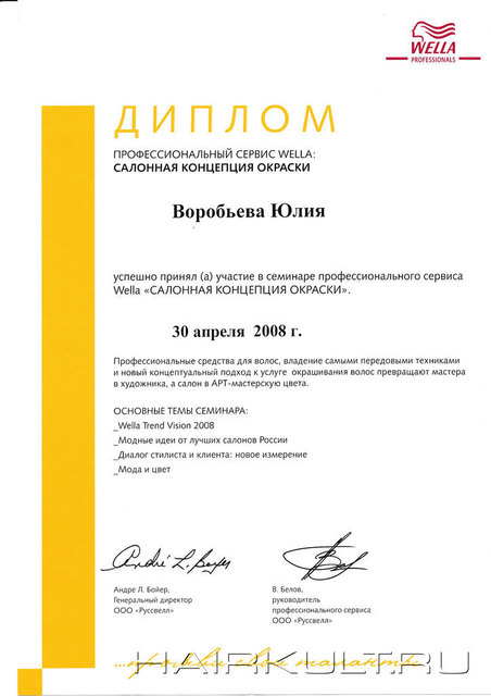 | 2008 | WELLA | Диплом WELLA COLOR PODIUM MASTER |